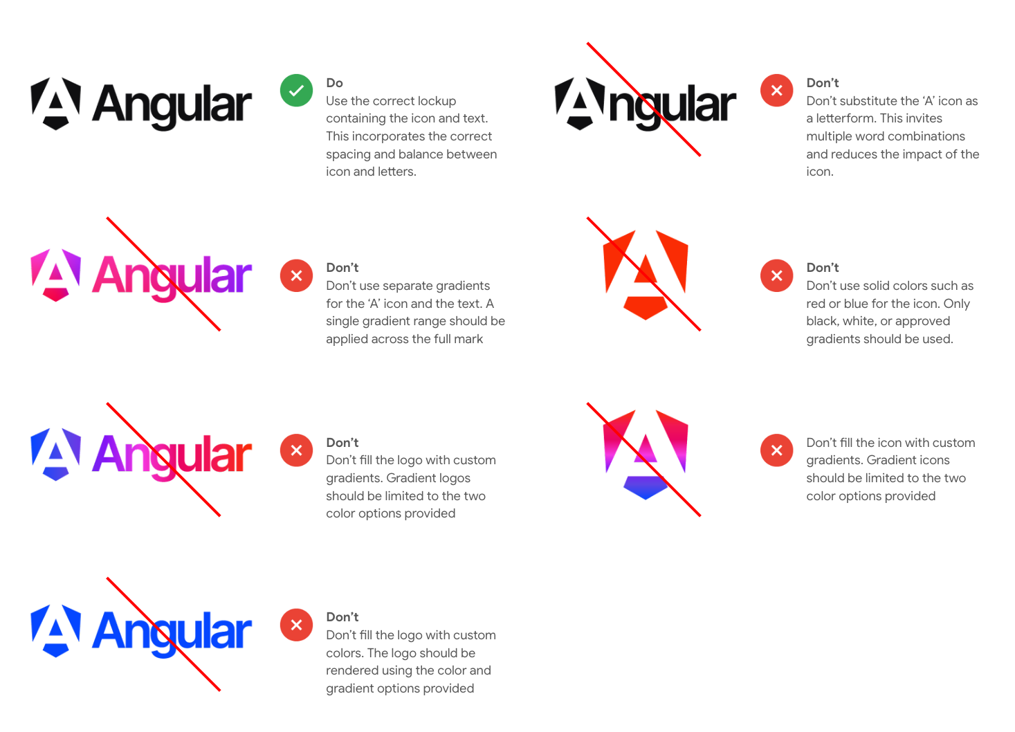 Angular’s success is deeply connected to our community. We know many communities, meetups, conferences, blogs, websites, YouTube channels and developers have built their brand on top of ours. This logo is for us and our community, and it’s important that you can join us in updating your brand as well.